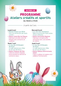 Pendant toutes les vacances nous sommes ouvert de 10h00 à 19h00 et du lundi au vendredi nous vous proposons des ateliers sportifs et créatifs pour les enfants à partir de 4 ans.