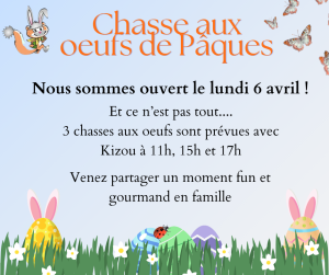 Pour fêter Pâques, Kizou organise plusieurs chasse aux oeufs le lundi 6 avril à 11h00, 15h00 et 17h00.